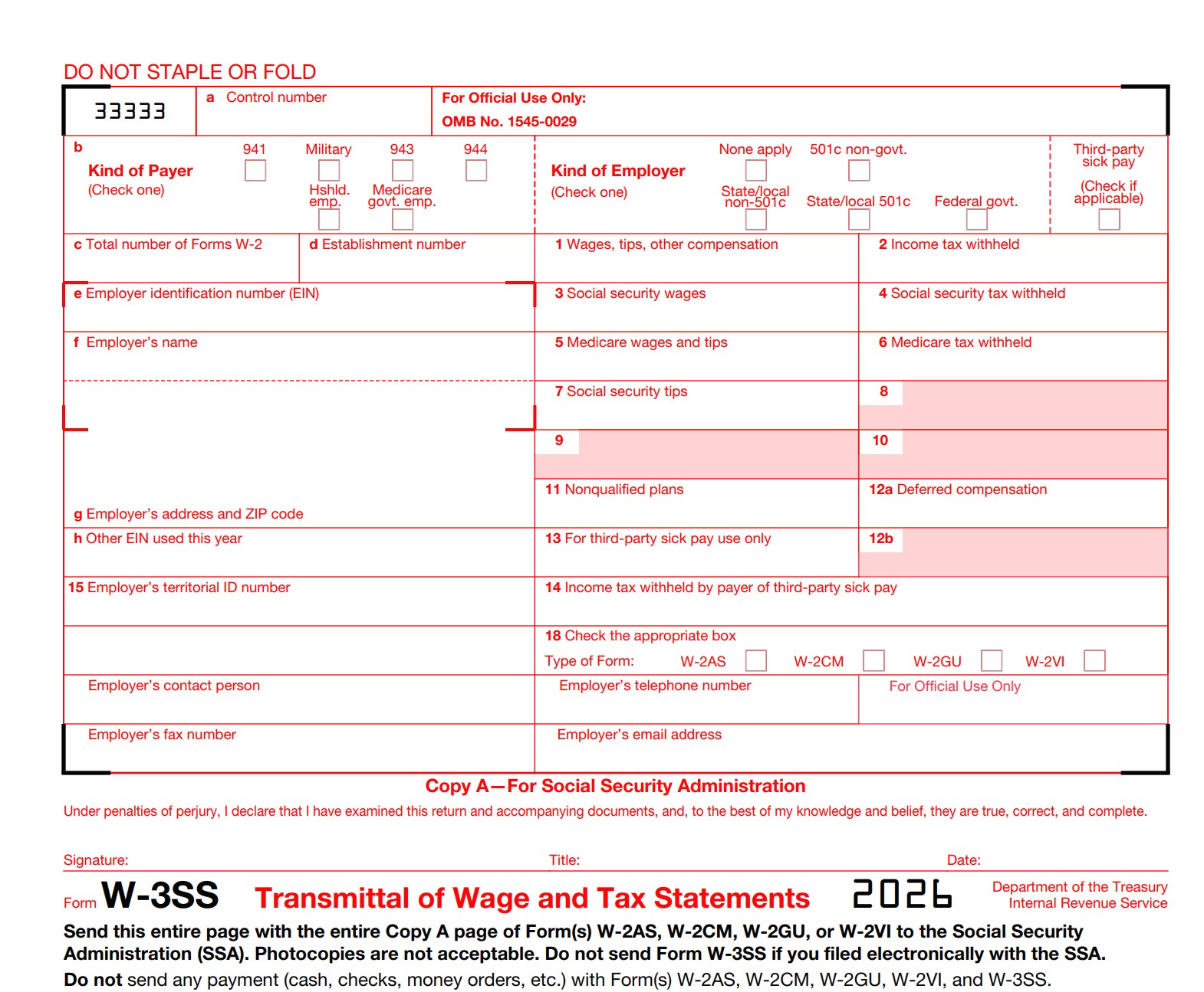 For a full list, download the 2026 Form W-3SS PDF (used for 2025 filings).
