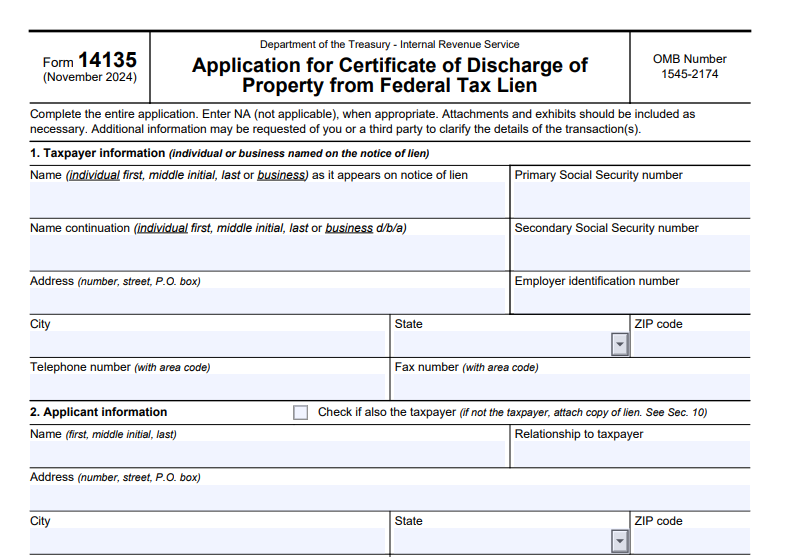 Navigating a federal tax lien can be challenging, but IRS Form 14135 provides a structured way to discharge specific property and move forward with sales or refinances. By gathering the right documents, choosing the correct basis, and filing promptly, you increase your chances of approval. Always refer to official IRS resources for the most accurate guidance, and consider professional tax advice for complex situations. Resolving tax liens promptly can protect your credit and financial future—start by checking your lien status today.