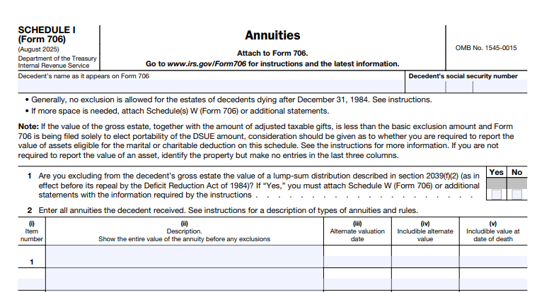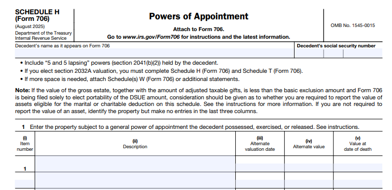 This schedule ensures compliance with IRC Section 2041, which mandates inclusion of property subject to a general power in the decedent’s gross estate. For 2025 decedents, even estates below the $13,990,000 threshold may file Form 706 solely for portability of the deceased spousal unused exclusion (DSUE) amount, but Schedule H is still required if applicable.