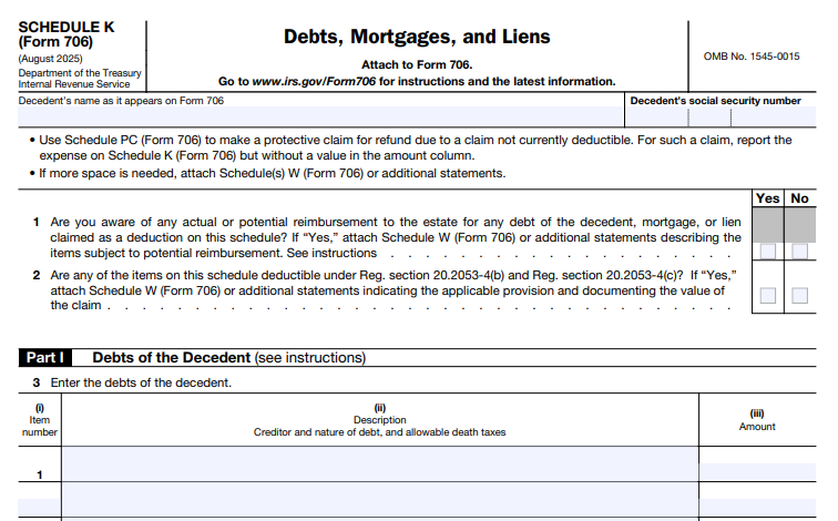The IRS redesigned Form 706 and its schedules in 2025 for efficiency, separating schedules into standalone PDFs and updating numbering (e.g., Parts I–VI use Roman numerals). The estate tax closing letter (ETCL) fee dropped to $56 for requests after May 21, 2025, and representation now requires separate Form 2848. No substantive changes affect Schedule H’s core rules, but inflation adjustments apply to exclusion amounts.
