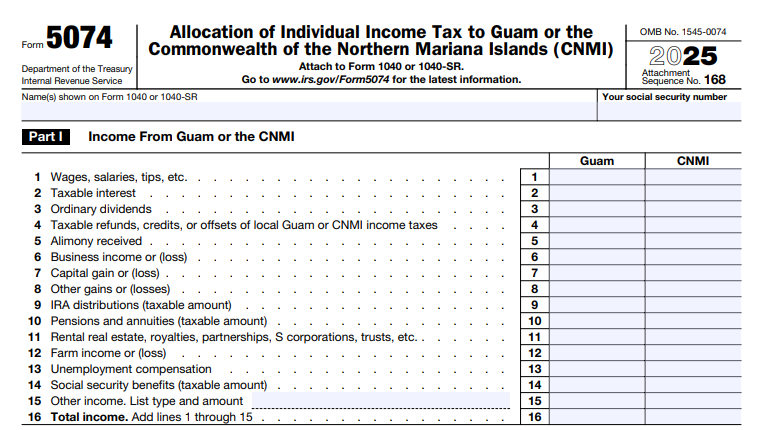 - Nonresident Aliens: File a U.S. Form 1040-NR for U.S.-source income and a separate territorial return for Guam/CNMI income. Form 5074 typically isn’t required unless you’re treated as a resident alien.